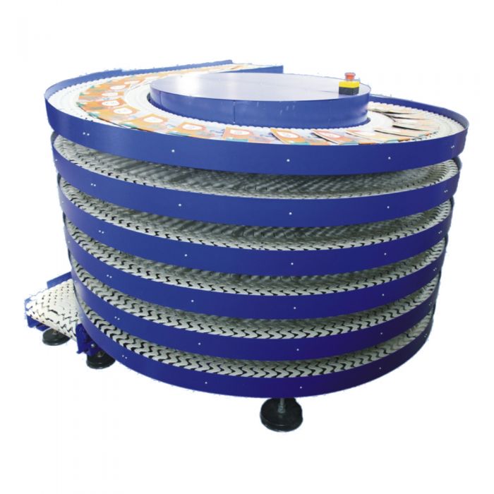 Spiral Conveyor for Books is connected between the perfect binding line and the three -knife trimmer, it's a compact and extremely reliable for the vertical transport of perfect binding books, this allows enough time for the perfect binding books' cooling and forming. The chain is made up slats and trolleys acetal resin reinforced, supported by bearings that run on specific guides. Spiral Conveyor is permeability, that contribute to efficiency and effectiveness gains, avoiding books stuck, the structure is compact, save space, it doesn't require any maintenance, save labor.